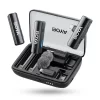 Incluye una funda de carga de 1000 mAh, que permite hasta 30 horas de uso total y recarga completamente el micrófono dos veces. Cada carga dura 1.5 horas, y el transmisor funciona hasta 10 horas seguidas, ideal para sesiones de grabación prolongadas.