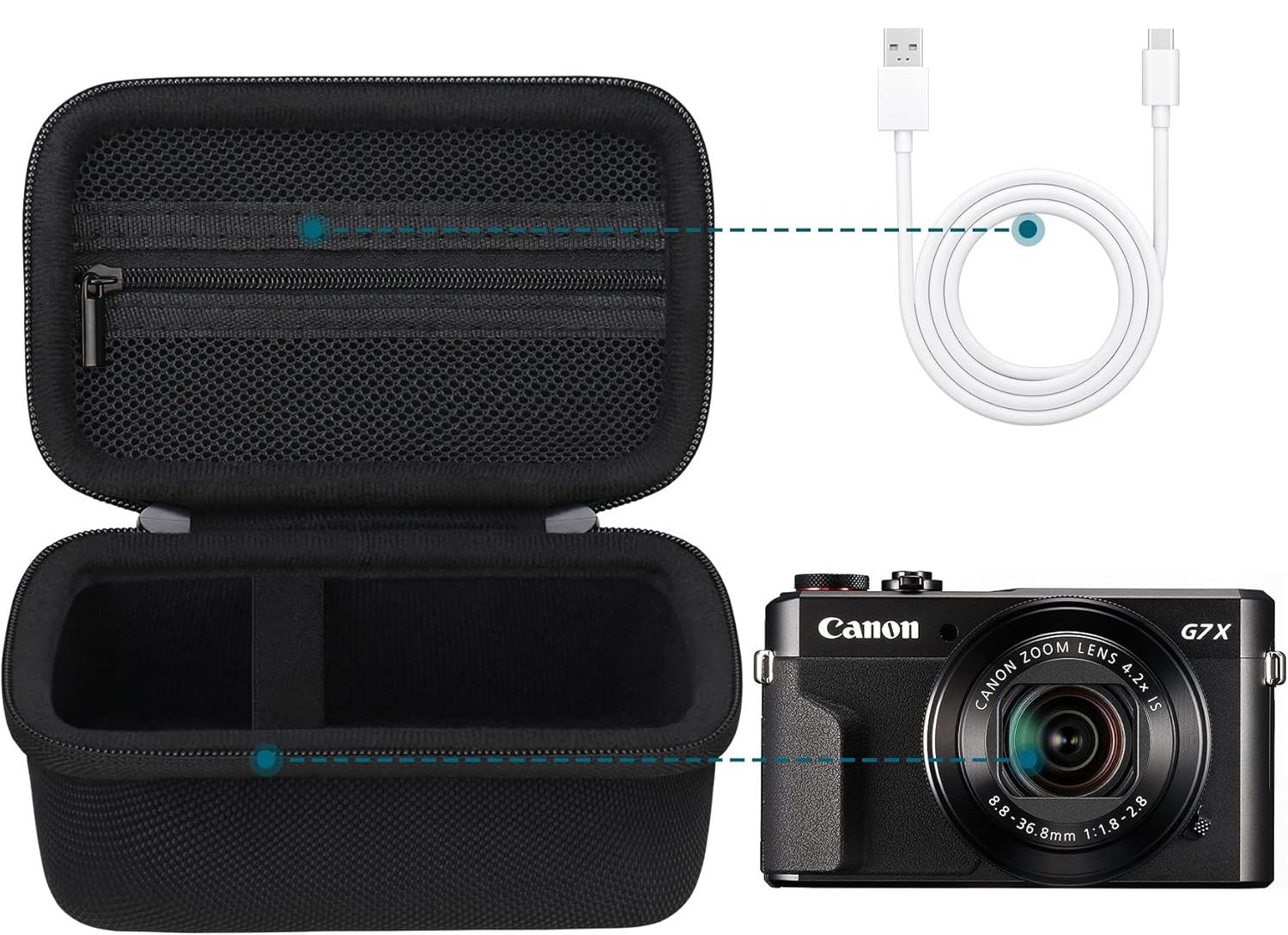 Esta funda fue diseñada específicamente para ajustarse perfectamente a cámaras Canon PowerShot G7 X Mark II, G7 X Mark III y Canon PowerShot V1. Además del compartimento principal para la cámara, cuenta con un bolsillo de malla con cremallera donde puedes guardar baterías adicionales, cable USB, tarjetas de memoria u otros accesorios pequeños. Es una solución práctica y compacta para llevar todo lo esencial en un solo lugar. (La cámara y los accesorios se venden por separado).