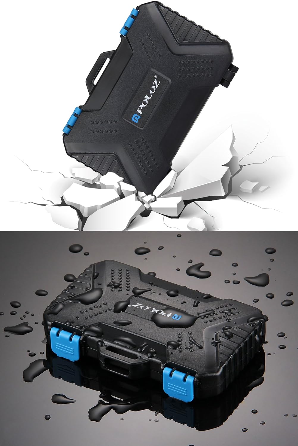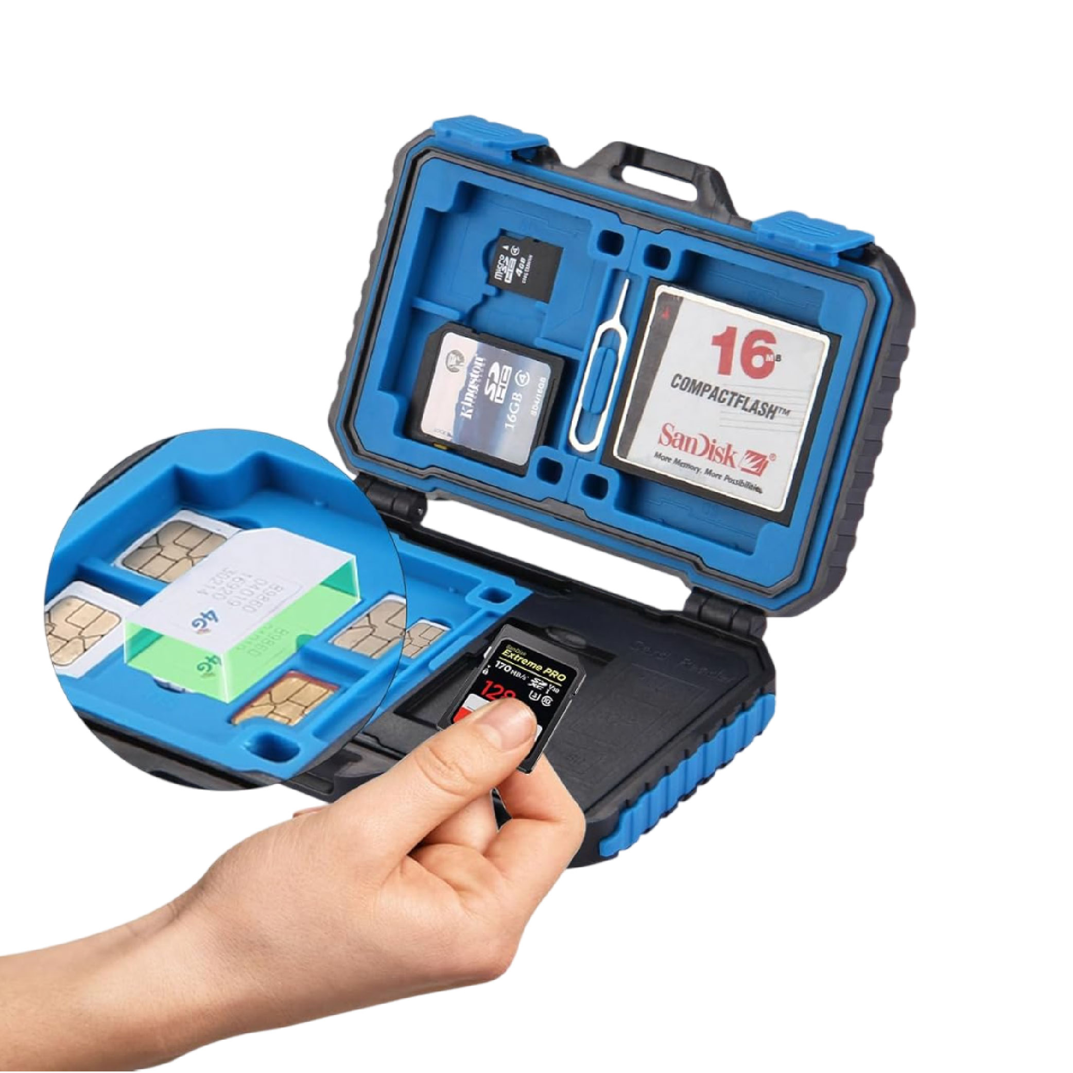 El diseño incluye un sello de material TPV azul impermeable que previene la entrada de agua, polvo y residuos. Esto garantiza que tus tarjetas de memoria estén siempre protegidas, incluso en entornos exigentes o condiciones climáticas adversas.