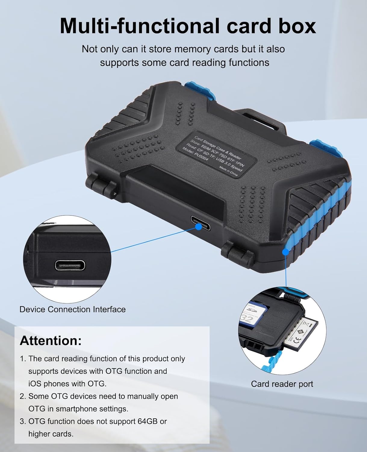 Gracias a su puerto micro USB 3.0, esta caja de tarjetas no es solo un contenedor, sino también un lector multifuncional. Puede leer tarjetas TF, CF y SD con velocidades de transferencia de hasta 5 Gbps, facilitando el acceso a tus archivos de forma rápida y práctica.