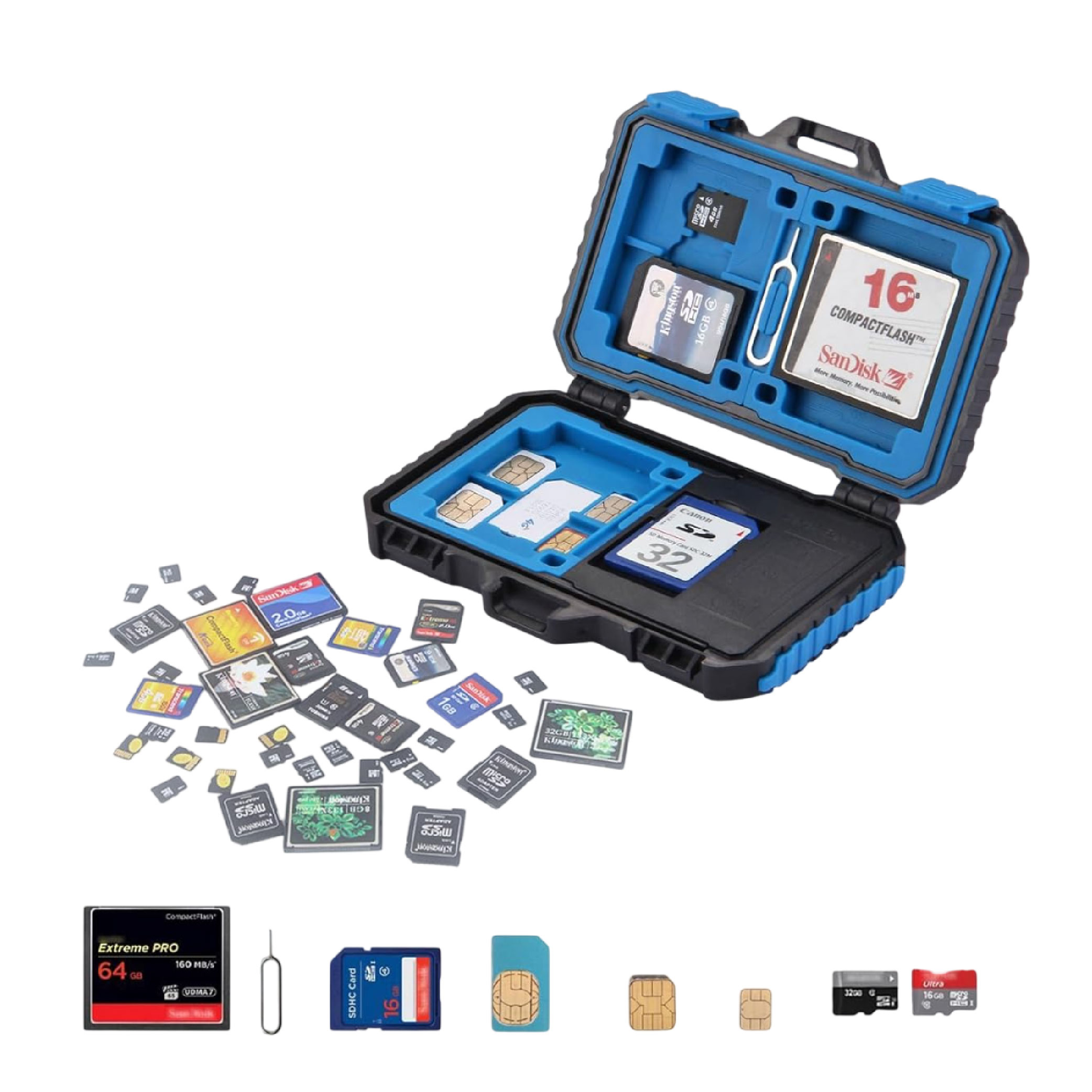 Con capacidad para almacenar hasta 22 tarjetas, incluyendo diferentes formatos como SIM, CF, SD y TF, esta caja ha sido diseñada inteligentemente para aprovechar al máximo el espacio sin comprometer la portabilidad. Es ideal para profesionales que manejan varios dispositivos y necesitan mantener todo organizado.