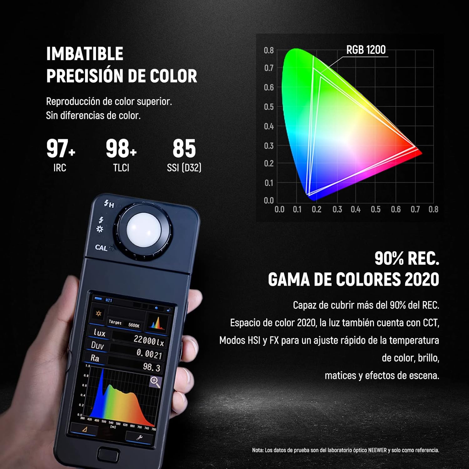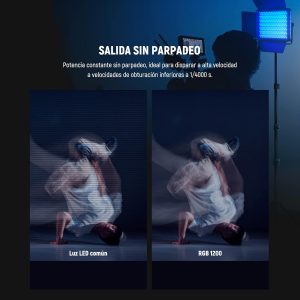 Cada luz RGB1200 ofrece una salida luminosa de hasta 7300 lux a 1 metro, proporcionando una iluminación potente, uniforme y profesional. Cuenta con temperatura de color ajustable entre 2500K y 8500K, lo que permite trabajar desde tonos cálidos hasta luz blanca fría. Sus índices CRI 97 y TLCI 98 garantizan una reproducción de color precisa y natural, ideal para fotografía y video profesional. Además, permite regular el brillo de 0% a 100% en incrementos del 1% y cuenta con ajuste verde/magenta para combinar con otras fuentes de iluminación. Su funcionamiento libre de parpadeo permite grabar incluso con velocidades de obturación altas.