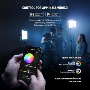 Las luces pueden controlarse fácilmente mediante los controles integrados en cada panel o a través de la aplicación móvil Neewer. Gracias a su conexión inalámbrica de 2.4 GHz, permite manejar hasta 8 grupos y controlar hasta 255 dispositivos simultáneamente. Desde el control se pueden ajustar temperatura de color, brillo, modos HSI y efectos de escena de manera rápida y precisa.
