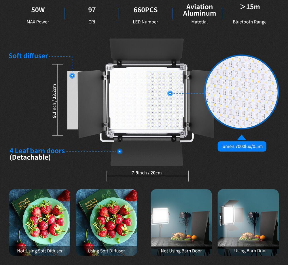 Cada panel incorpora 660 LED SMD de alto rendimiento (170 fríos, 170 cálidos y 320 RGB), lo que permite trabajar tanto en iluminación tradicional como en escenarios creativos. El modo RGB ofrece acceso a 360 colores, con ajustes precisos de tono y saturación, ideales para crear atmósferas únicas, fondos dinámicos y efectos visuales profesionales en fotografía y video.