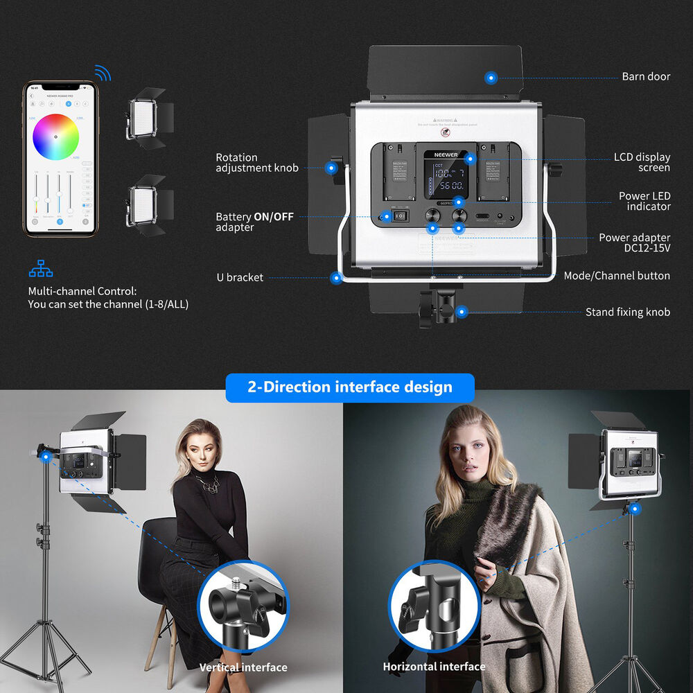 El sistema de control permite realizar todos los ajustes directamente desde la pantalla LCD integrada, utilizando botones y perillas de fácil acceso. Además, gracias al control inalámbrico mediante la aplicación NEEWER, puedes manejar múltiples luces, seleccionar canales, modificar brillo, color y parámetros HSI desde tu smartphone, optimizando el flujo de trabajo en sets pequeños o producciones más complejas.