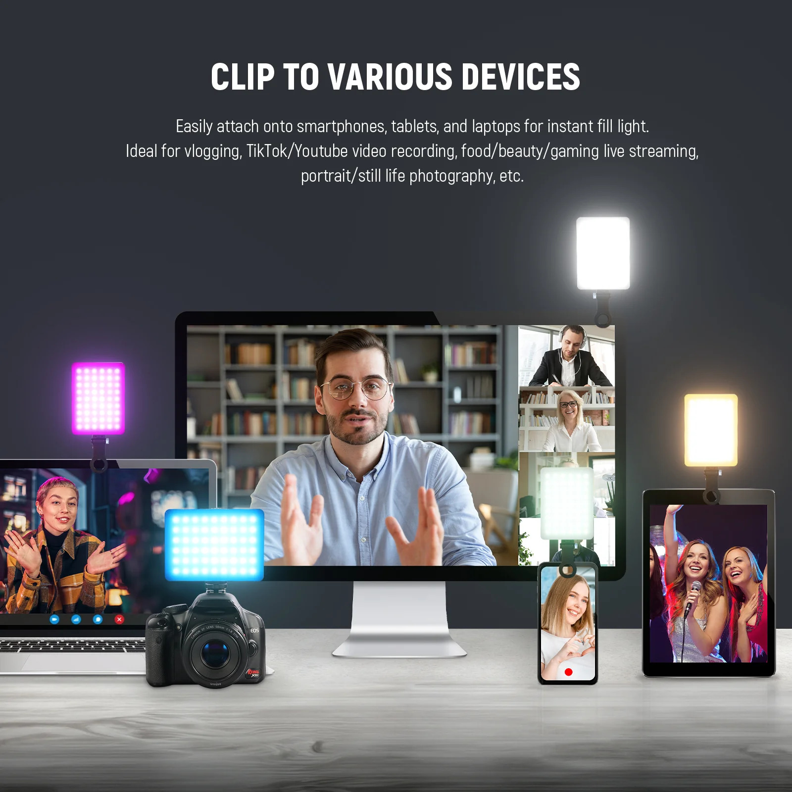 El panel cuenta con 94 perlas LED (frías, cálidas y RGB) para ofrecer una amplia gama de colores y temperaturas de color entre 2500 y 8500K.