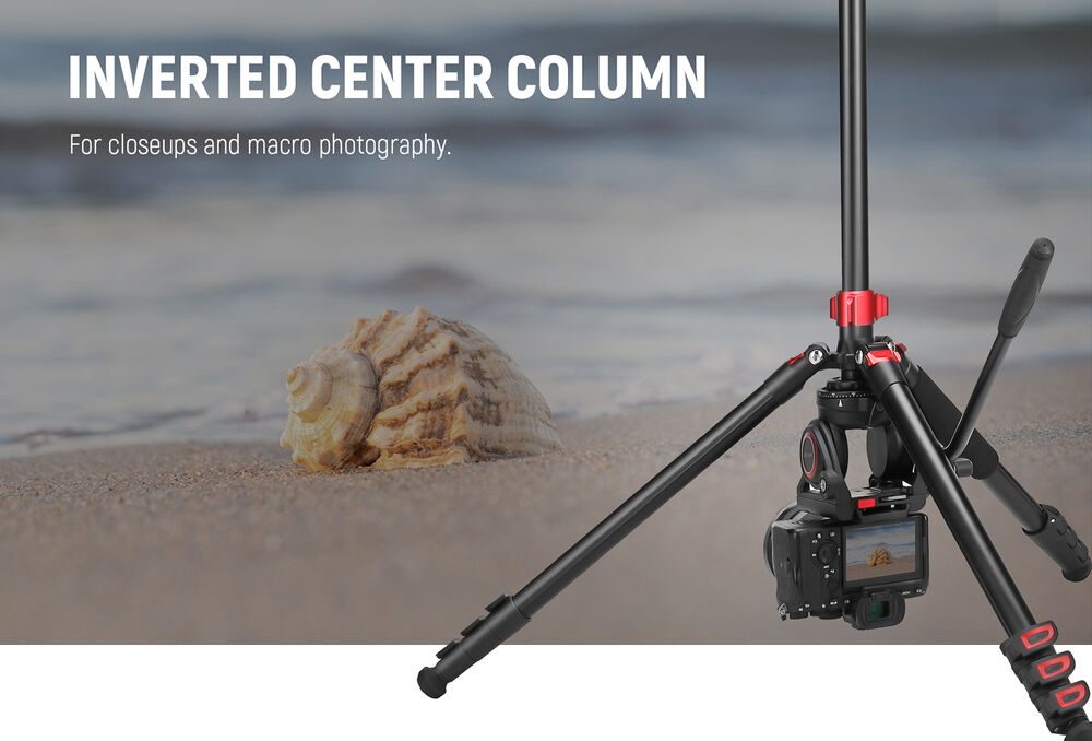El trípode ofrece un rango de altura de 61 a 183 cm (24 a 72″), con patas que pueden colocarse en 3 ángulos distintos para capturar desde tomas macro hasta planos cenitales. Las patas cuentan con goma antideslizante para superficies lisas, y pueden retirarse para usar las púas metálicas integradas en terrenos difíciles como barro, arena o pasto.